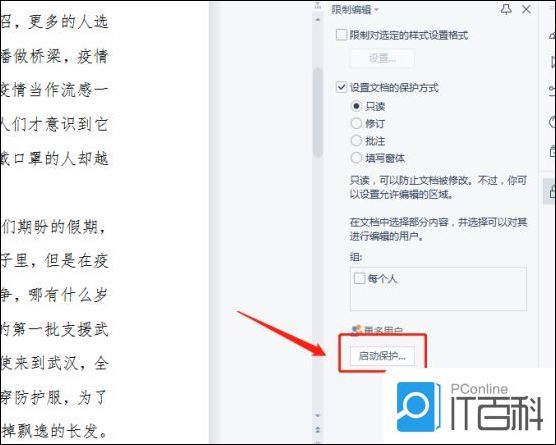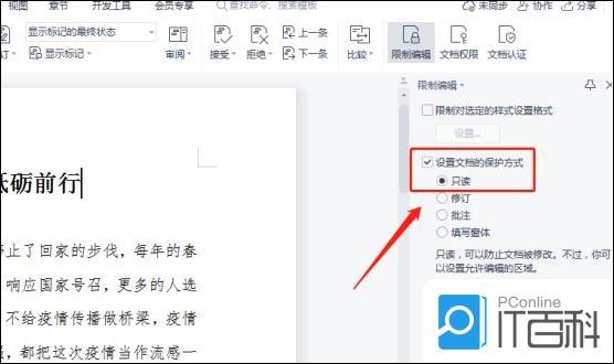 2.在文档的右侧会出现“限制编辑”属性栏,点击下边的“只读”,将其选中。
