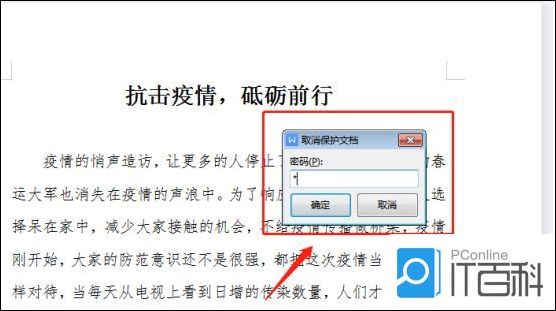 6.如果设置了密码,word就会弹出一个“取消保护文档”的对话框,输入密码,点击“确定”;没有设置密码的话直接就取消了。