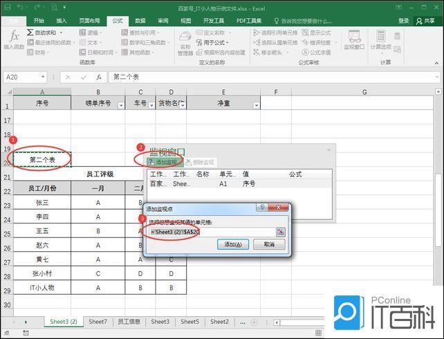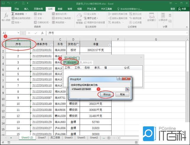 3、找到第一个表格,靠前的单元格,比如“序号”列名称;点击【添加监视】,在弹出的“添加监视点”对话框中点击【添加】;