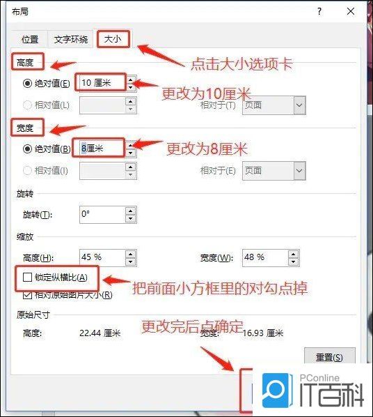 第五步、此时,选中需要修改大小的照片,比如第一张,点击鼠标右键会弹出菜单栏,在菜单栏里选择“大小和位置”,点击进去,弹出一个布局对话框,首先将对话框下方的“锁定纵横比”前面的对勾取消掉,然后更改对话框上方的“高度”和“宽度”的绝对值,小编这里更改为高10厘米,宽8厘米,然后点击“确定”按钮
