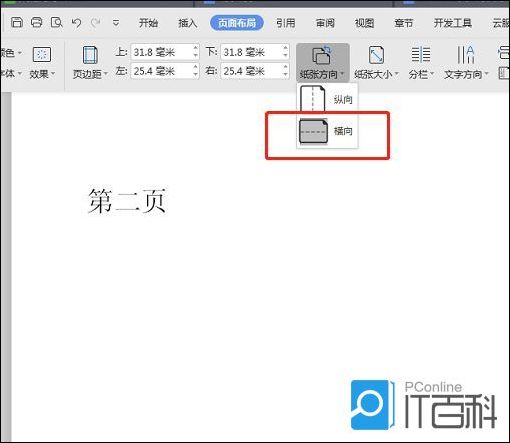 5、点击菜单栏页面布局-纸张方向-横向,如下图所示。