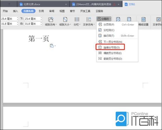 3、使鼠标光标停留在第一页,点开分隔符工具小菜单,点击连续分节符(O),如下图所示。