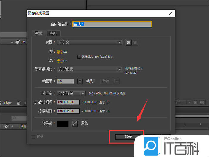 2、在弹出的窗口,设置合成的宽度、高度,点击“ 确定 ”。
