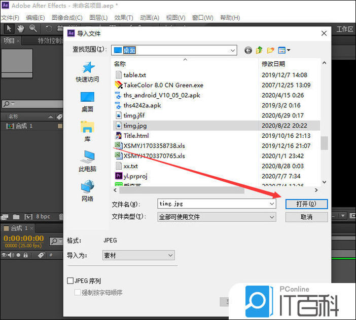 3、双击项目窗口,选择图片,点击 “打开 ”,导入图片素材。