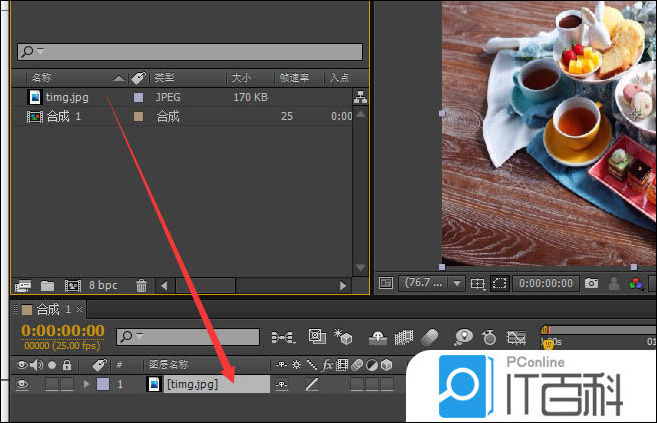 4、在项目窗口, 选中图片,拖动至时间线窗口。