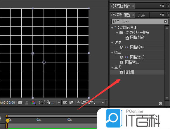 5、在效果和预置窗口,输入“ 网格 ”查找,将生成下面的“ 网格 ”效果拖动至时间线的图片上。