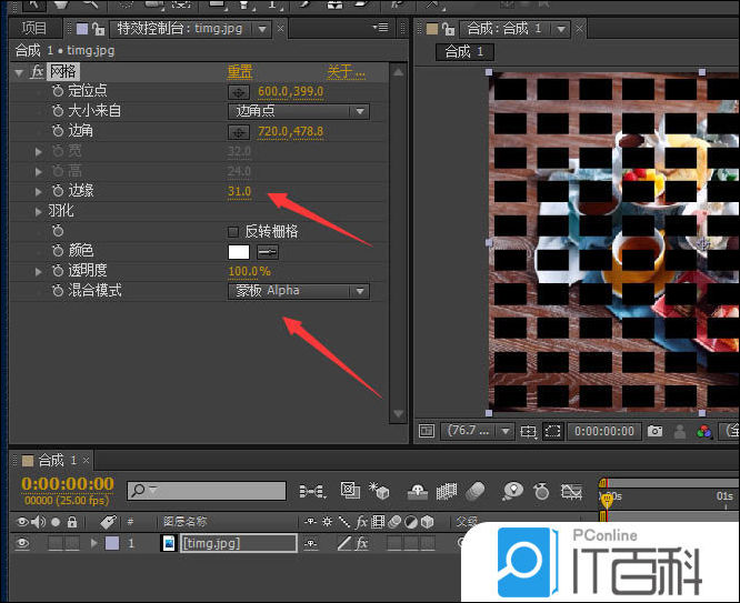 6、在特效控制台窗口, 设置“边缘”的值为31, 在混合模式选项中,选中“ 蒙板Alpha ”,便可以把图片作为网格的背景了。