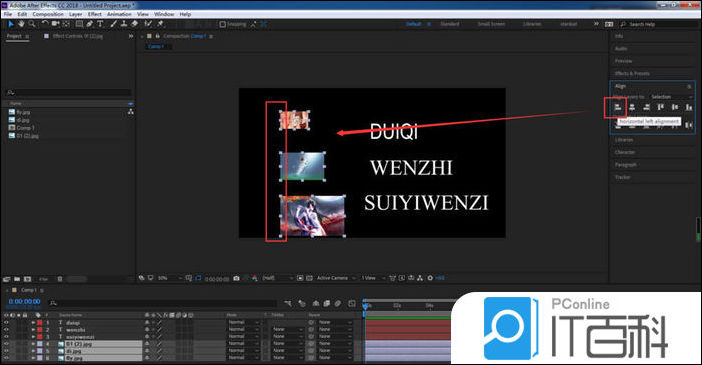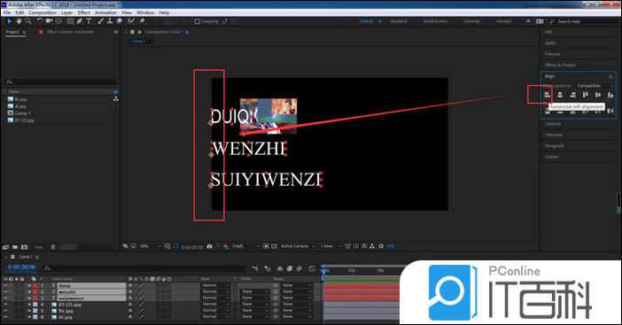 7、将对其方式改为合成之后,我们选择文字层, 点击左对齐 ,可以看到文字就会以合成的左边缘进行对齐;