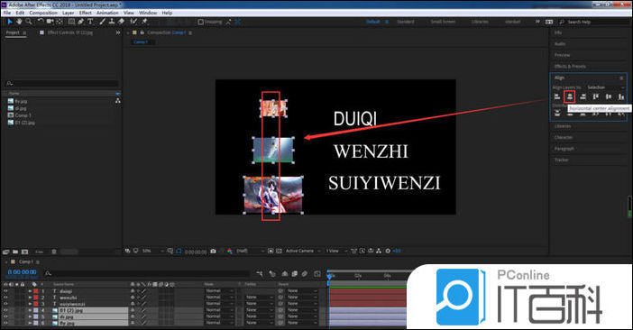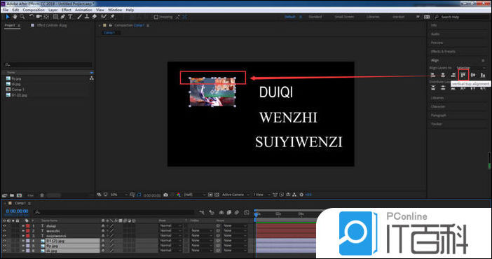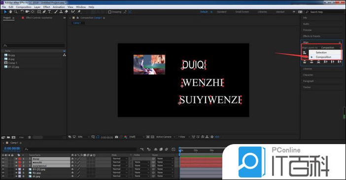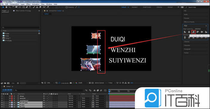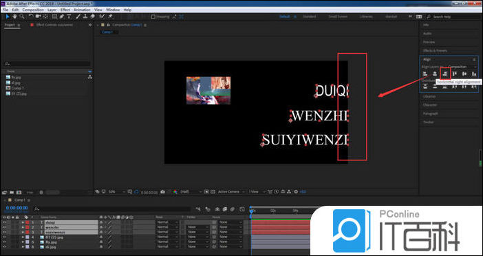 8、选择右对齐,文字图层就会以合成的右侧边缘为基准对齐。
