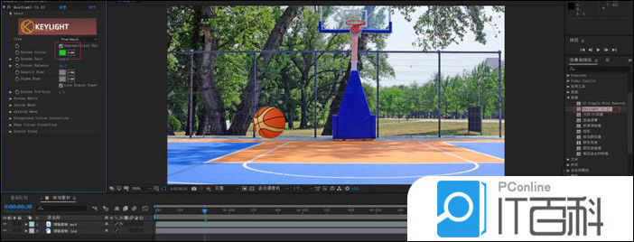3、点击篮球素材——效 果和预设面板——抠像—— keylight ——吸管——吸篮球素材绿色位置