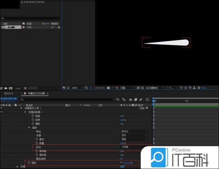 3、通过调整字符间距, 形成点成线 ;然后动画那边添加缩放属性;将缩放数值调整为0;范围选择器里面的高级:把形状选择为下斜坡 这样直线变成了锥形;