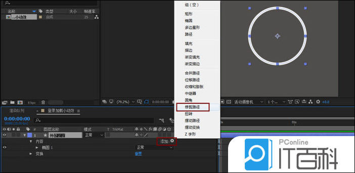 3、打开属性,点击旁边的添加,给圆圈添加修剪路径,然后给开始和结束,偏移量的 值k关键帧,开始的值(0,25,50,80,100)结束的值(0,30,50,70,100)偏移的值(0,270)这些只是供大家去参考 ,具体可以根据实际去调整。选中所有关键帧, F9来个缓动。