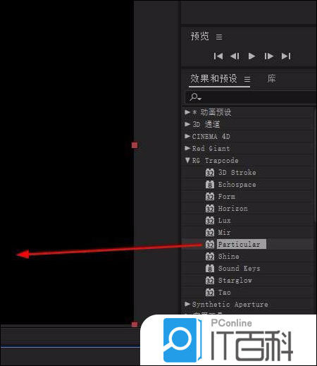3、在 效果和预设面板 中,我们直接将粒子特效拉到页面之中。