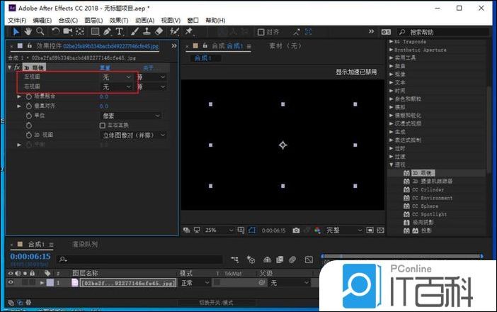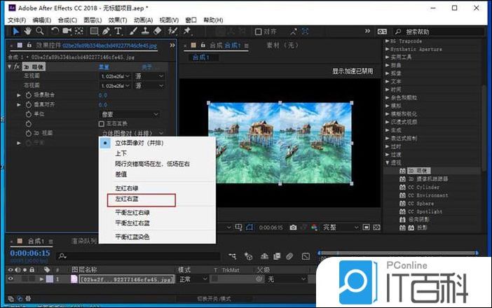 4、在效果控件设置3d眼镜的各项参数,将左视图和右视图都设置成同一个素材。