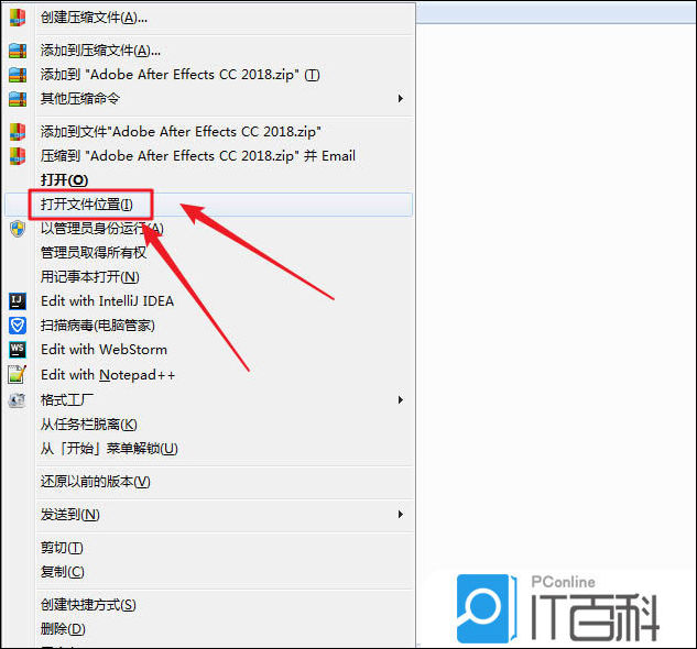 3、如果不清楚安装目录在哪里的,我们可以自己点击桌面上的AE图标,然后鼠标右键,找到“ 打开文件夹所在位置 ”,进入AE软件的安装目录