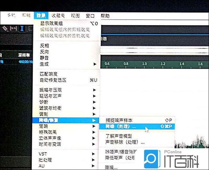 4、全选音频,选择「 效果 」「 降噪/恢复 」「 降噪(处理 )」