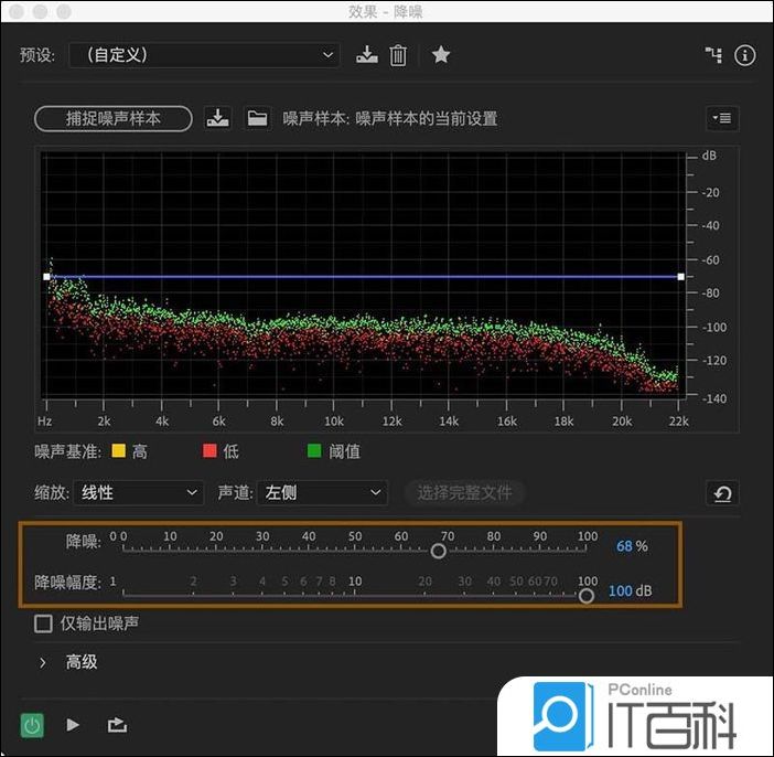 5、在新弹出的窗口中,取消勾选「 仅输出噪声 」,设置「 降噪 」和「 降噪幅度 」