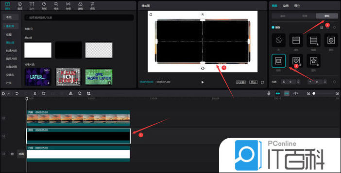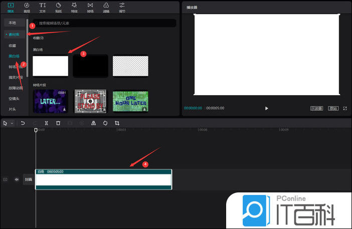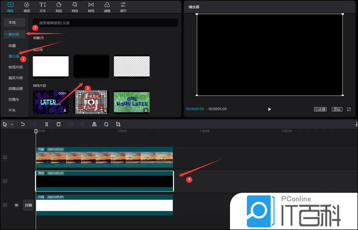 再次点击素材库按钮,然后点击 黑白场 ,选择黑场,将其添加到视频轨道中,并调整黑场位置如下图序号4所示。