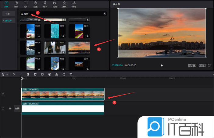 在搜索栏中输入风景两字,选择一段视频素材, 将其添加到视频轨道中 ,并调整白场和素材时长一致,见下图。