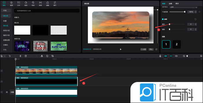 选中黑场素材,往右下方拖动,使它形成下图序号2展示的效果就可以了,最后点击播放按钮就能看到视频效果了,见下图。