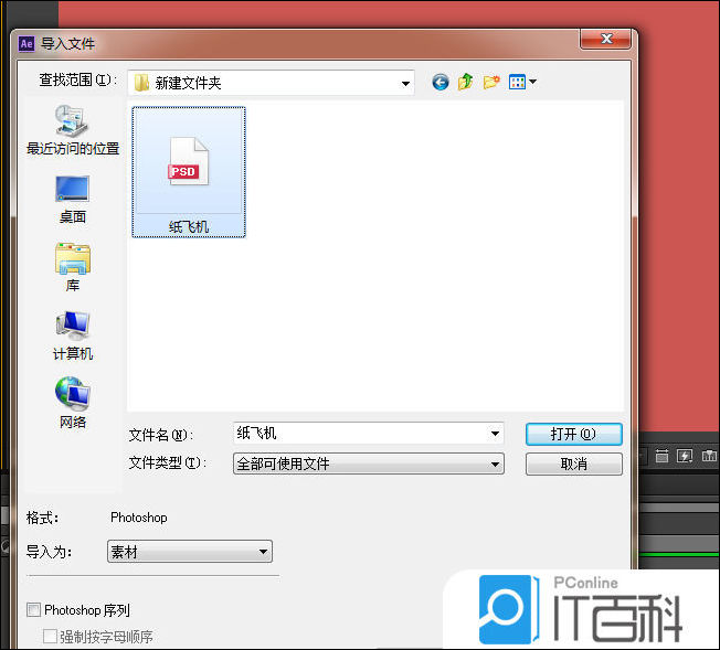 2、 CTRL+I 导入准备好的素材,我这边是在网上找了一个纸飞机作为这次的素材,主要是学习制作方法和思路,具体素材,大家可以去网上下载。