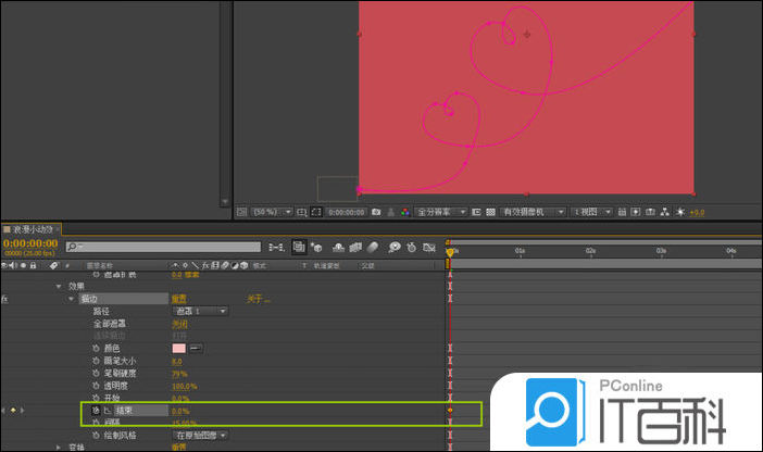 5、选中路径载体固态层,给它添加描边的效果, 效果-生成-描边 。调整相应属性,这边通过描边结束属性来K帧动画, 0帧处给结束k个关键帧, 最后一帧k上100.这个时候就可以按下空格键预览效果了,通过实际效果做来做细微的调整。