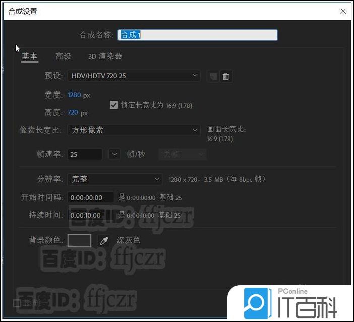1、新建一个合成项目,分辨率为1280*720;方形像素,25帧率,时间为10秒.在合成层添加一个 纯色层 ,颜色为黑色。