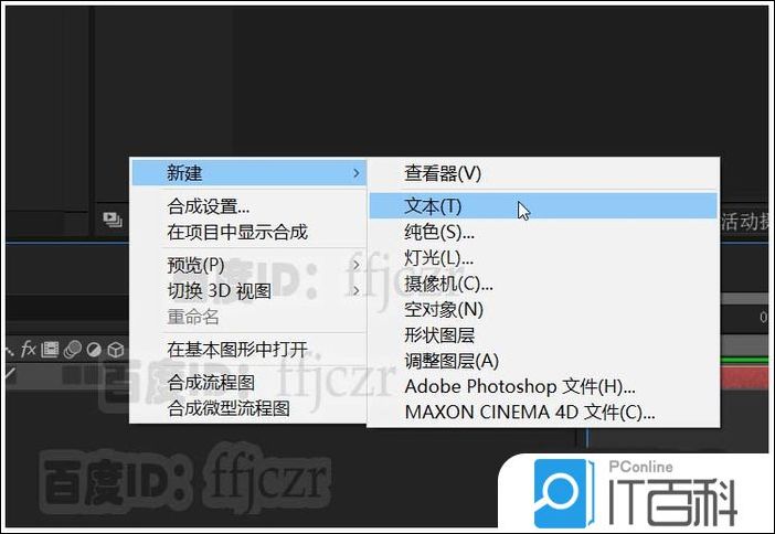 2、在合成层添加一个 文本层 ,并在显示区输入相应文字,且让文字居中显示。