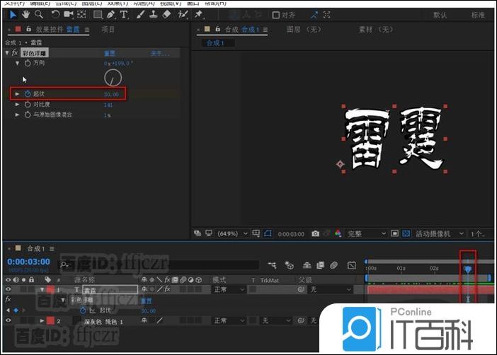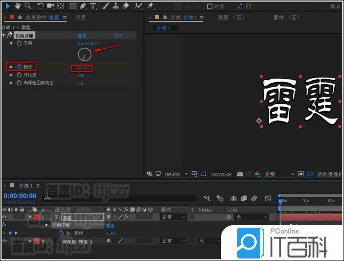 4、在效果控件栏中展开 彩色浮雕的列 表,调整方向为200度;在时间线为0时激活起伏的关键帧,值为2;在时间线为3时起伏的 关键帧 值为30.