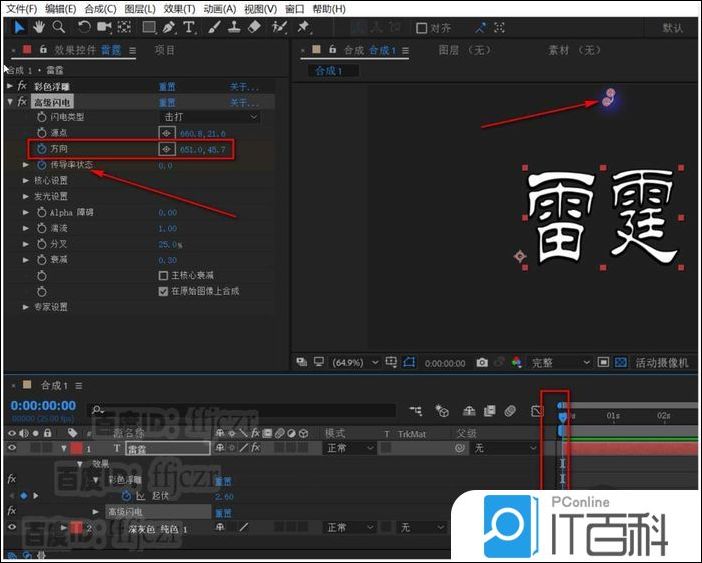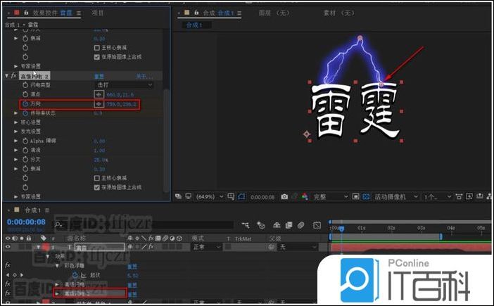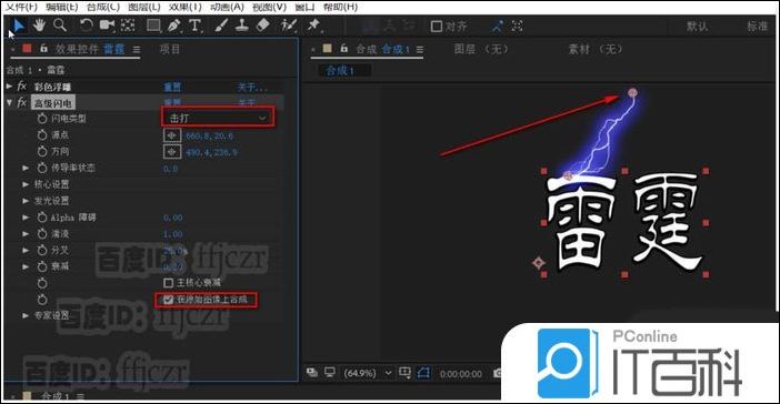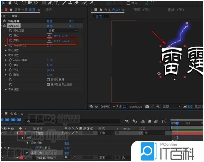 5、给文字层添加效果,生成中的 高级闪电 ;在高级闪电列表中,调整闪电类型为击打, 勾选在原始图像上合成。 此时可以看到修改后的闪电显示出来。 选中闪电的源点及方向 ,将闪电调整到文字的上方,如图所示。