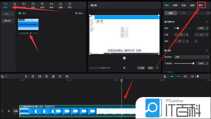 2.在媒体中导入视频,鼠标双击选中时间轴中的片段,点击右上角的调节按钮