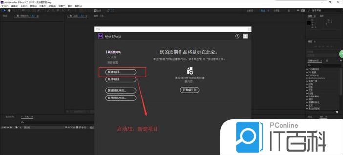 1、用鼠标左键双击AE软件的快捷图标,启动AE后期特效软件,启动AE软件之后,会看到一个 开始窗口 ,在开始窗口中选择单击新建项目,创建一个 AE项目 。