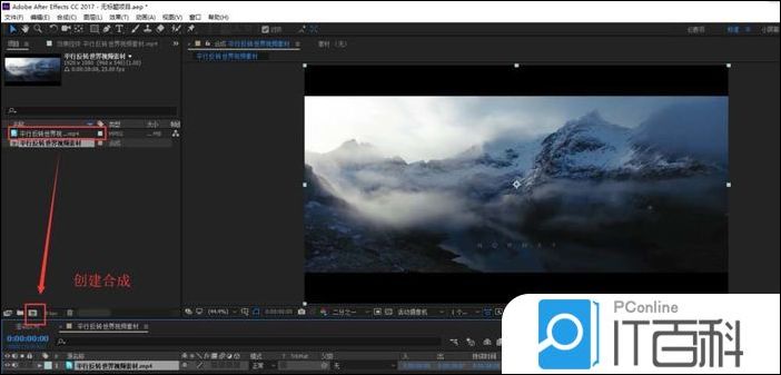 3、选中导入的视频素材,选中之后按住鼠标左键不松将其拖动项目窗口下方的 合成按钮 上,由视频素材来创建一个 AE合成 。