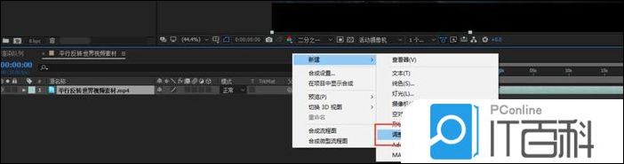4、在新建的合成的图层窗口的空白处右键鼠标,在出现的右键选项中选择新建中的 调整图层 ,创建一个调整图层进来。