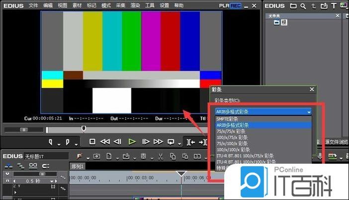 1、EDIUS软件的第一步是找到时间线上方的 T ,点击选择倒数第三个“ 彩条 ”