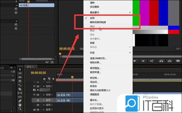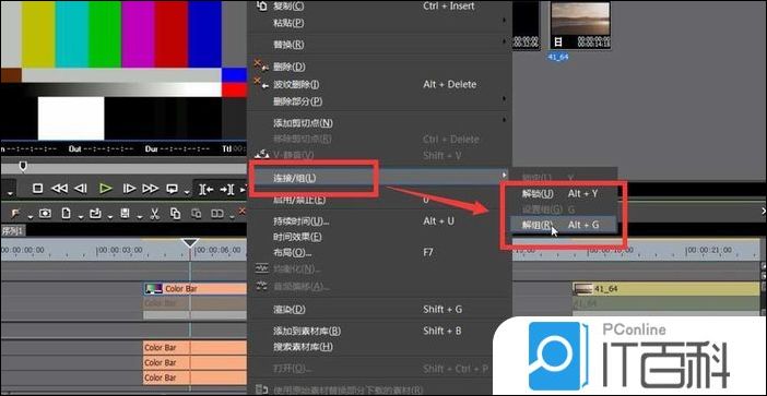 2、将彩条导入时间线之后,进行彩条 音视频链接的解除 。