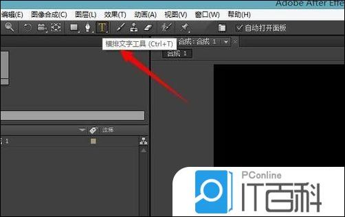 3、在“ 工具栏 ”找到“ 横排文字工具 ”(快捷键 ctrl+t ),单击选中,随后鼠标指针发生改变。在合成窗口选定文字创建位置,单击输入文字,在右侧的“ 文字 ”一栏可以对文字进行调整。