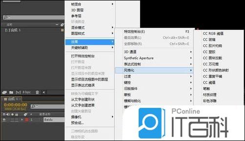4、在“合成栏”右键单击,依次选择: 效果—风格化—辉光,选定后文字便产生了发光特效 。左侧弹出了“ 特效控制台 ”,在这里可以调整文字发光的阈值,颜色,模式等等...
