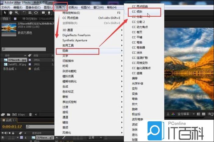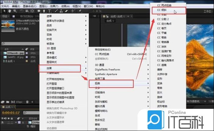 5、还可以这样添加倾斜效果:上方工具栏里面的 特效-扭曲-CC倾斜