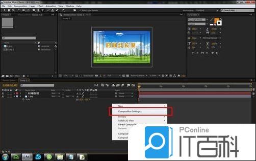 2、在时间线空白处,右键找到并打开“ 合成属性 ”。