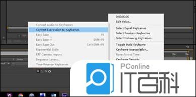 5、选中左边的关键帧(上图中左边的黄色菱形按钮),然后右键选择“ Keyframe Assistant (关键帧辅助)”下的“ Convert Expression to Keyframes (转换表达式为关键帧)”。