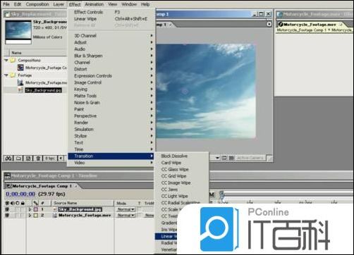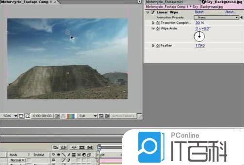 2、将天空的素材放到视频图层的上面,添加“ 线形檫除 ”效果,根据视频要求,修改参数