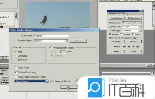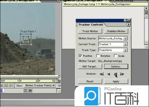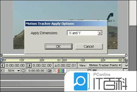 4、出现的特效对话框,选择“ Track motion”选 项,视频中出现跟踪点,将跟踪点放到视频中可以跟踪的位置(最好是视频中远处的位置,这样有纵深感。), 点开Options 修改参数