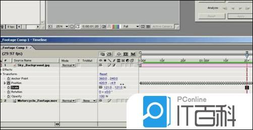 7、回到合成窗口,发现天空素材跟着动了 但是错位穿帮了,这里就要打开天空图层的属性手动调节了, 大部分是位移属性 和缩放属性
