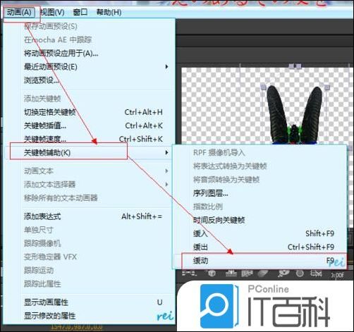6、通过关键帧差值的设置让翅膀的扇动更自然。在关键帧设置中,无论是空间还是时间的差值默认都是线性的,即运动是走直线的,速度是匀速的,但是自然界往往都是曲线的,都是非匀速的,所以要对差值进行设置。首先, 按住shift键 ,鼠标单击选中上一步记录的四个关键帧, 执行动画>关键帧辅助>缓动 ,或者直接按住 F9快捷键 。