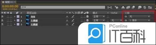 8、利用父子层关系, 将左翅膀层和右翅膀层与身体层组成一体 ,这样只要设置身体层的关键帧动画,整个蝴蝶就一起运动了。如图示,将左翅膀和右翅膀两个层的父层设置成身体层。