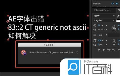 AfterEffects字体出错83::2 CT generic not ascii如何解决?这是一个棘手的问题!因为一旦出现此弹窗,弹窗无法关闭,AE无法操作,只有强制退出,如果所做的东西未保存,只能眼睁睁的强制关闭AE,那更是个悲伤的故事!还好我发现了如何关闭此弹窗的巧方法,能避免未保存必须强制关闭AE的悲剧发生!