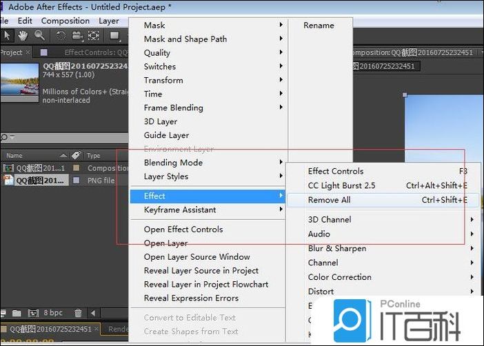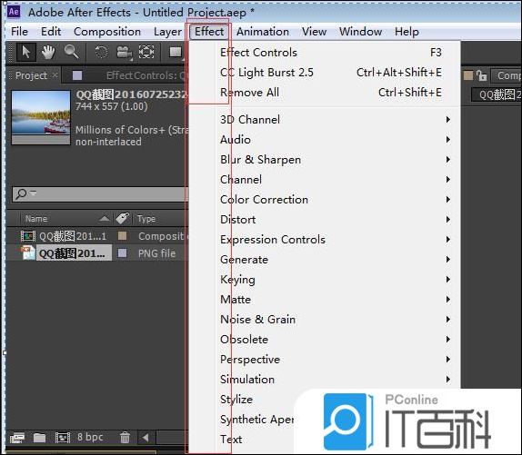 首先打开ae软件,新建一个合成,并打开图片,有关这方面的基础可以百度去搜下。