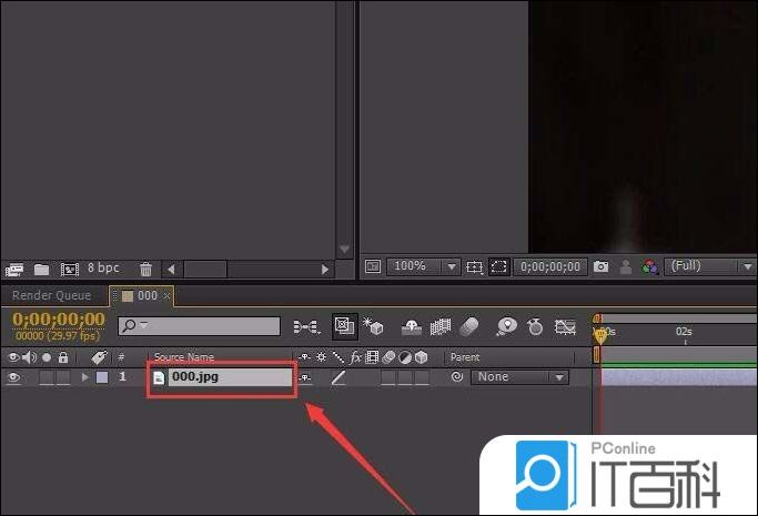 4、选择该图片用鼠标左键拖拽到 composition里 , 并选择该 图 片,如图所示: