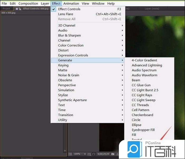 6、点击 effect选项 ,在其子级菜单里找到 generate选项 ,在 generate选项 的下拉菜单里找到 lens flare选项 ,如图所示: